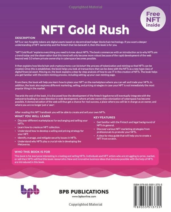 It then explains how blockchain and cryptocurrency can kickstart the process of tokenization and minting so that NFTs can be created. Once this is established, the book helps you look at transactions that can be done with the NFTs as a new type class of digital financial asset. Moving on, the book explains a step-by-step analysis of how to use IT in the creation of NFTs. The book helps you get familiar with the entire minting process, including setting up your own minting page.